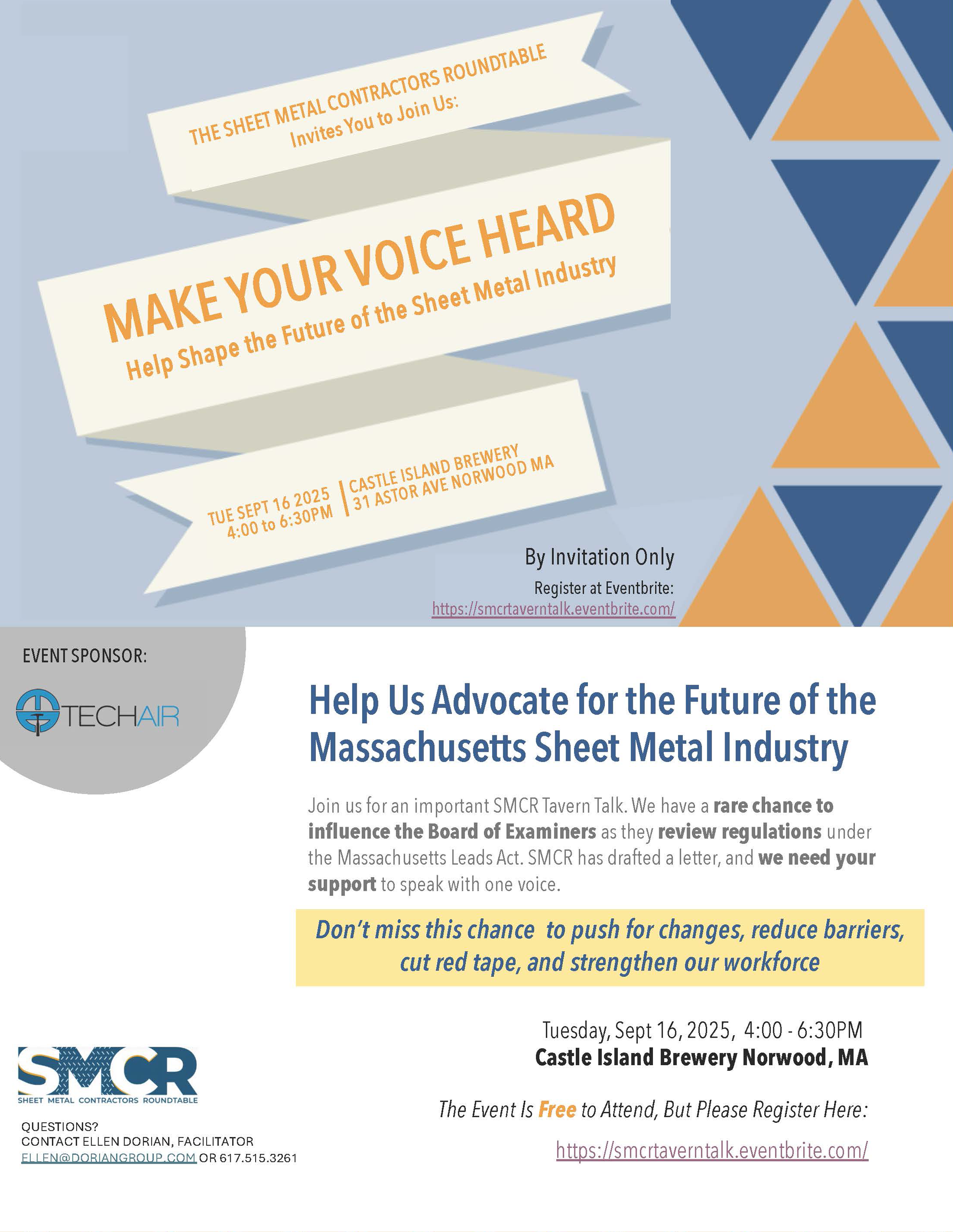 Join us for an important Tavern Talk, hosted by the Sheet Metal Contractors Roundtable. Tuesday, September 16, 2025 4:00 PM–6:30 PM Castle Island Brewing Co. 31 Astor Avenue Norwood, MA 02062 United States Register here: https://smcrtaverntalk.eventbrite.com/ Join us for an important SMCR Tavern Talk. We have a rare chance to influence the Board of […]